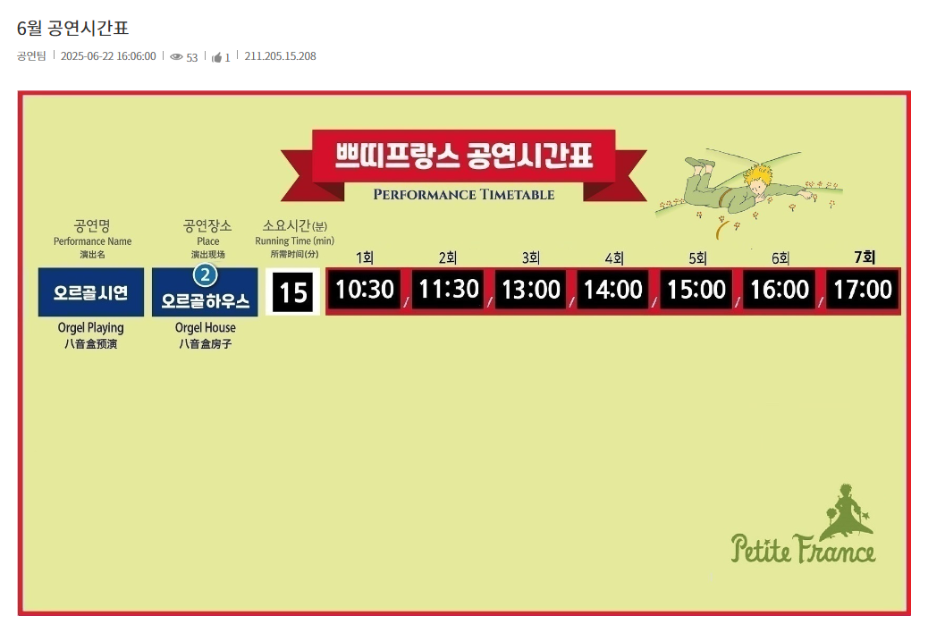 공연은 오르골 하우스, 야외극장 두 군데에서 진행되며, 각각 30분~1시간 간격으로 열립니다. 입구나 매표소에 비치된 당일 공연 시간표를 꼭 확인하고, 시간에 맞춰 이동하면 효율적인 관람이 가능합니다.
